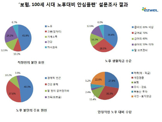 노후 생활이 염려되는지에 대해 직장인 83.6%가 '그렇다'고 답해 압도적으로 많았으며, 노후 생활을 염려하는 가장 큰 이유로는 '경제적 빈곤'(48.3%)이라는 응답이 과반수에 달했다. 이어 '건강 문제'(37.6%)와 '할 일이 없어질 까봐'(10.2%)가 그 뒤를 이었다.