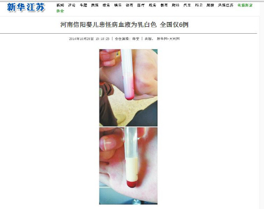중국의 한 신생아의 몸에서 채취한 혈액이 흰색으로 변해 충격을 주고 있다.