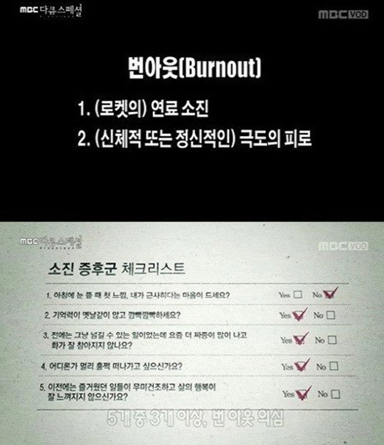 앞서 지난 6월 MBC 다큐스페셜은 '오늘도 피로한 당신, 번 아웃'이라는 제목으로 피로사회가 된 대한민국에 대해 다뤘다.
