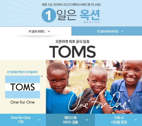 국내 대표 온라인 마켓플레이스 옥션(www.auction.co.kr)이 탐스(TOMS) 제품을 오픈마켓 최초로 공식 판매하고, '1일은 옥션' 행사를 통해 탐스 인기 상품을 최대 40% 할인가에 판매한다. 또 옥션과 탐스 페이스북 계정 이벤트를 통해 탐스 제품과 옥션 할인쿠폰 중 하나를 100% 증정하는 이벤트를 연다.