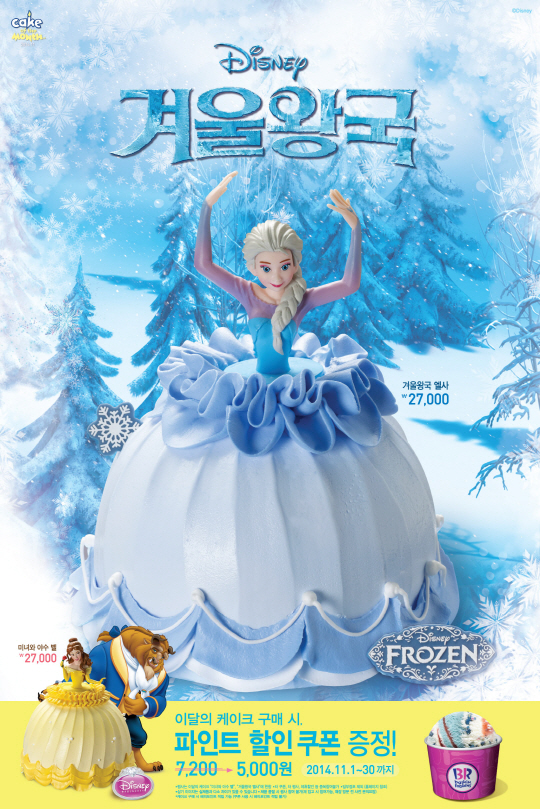 '겨울왕국 엘사'는 지난 겨울 인기를 끌었던 디즈니 애니메이션 '겨울왕국' 속 주인공 엘사의 모습을 케이크에 그대로 옮긴 제품으로 체리쥬빌레와 아몬드봉봉으로 구성돼 있다.