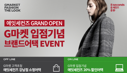 먼저 3일부터 9일까지 모바일 패션관 'THE LOOK'에서 에잇세컨즈 입점 기념 '에잇세컨즈 G마켓점 어택' 이벤트를 진행하고 에잇세컨즈 전용 20% 할인쿠폰(최대 5000원 할인)을 전 고객에게 G마켓이 지급한다.