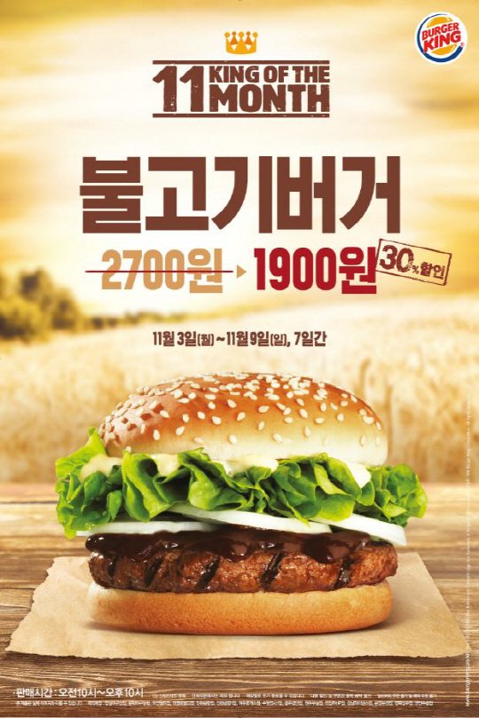 프리미엄 햄버거 브랜드 버거킹(대표 문영주)이 3일부터 9일까지, 7일간 '불고기버거' 단품을 1,900원에 판매하는 11월의 'KING OF THE MONTH' 프로모션을 진행한다.