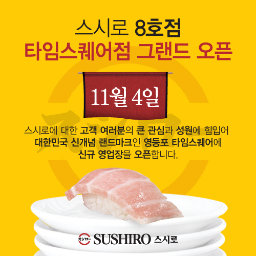 한편 스시로는 타임스퀘어점 그랜드 오픈과 맞물려 2015년 수능시험 날을 맞아 11월 한 달간 수능 관련 이벤트를 진행한다.