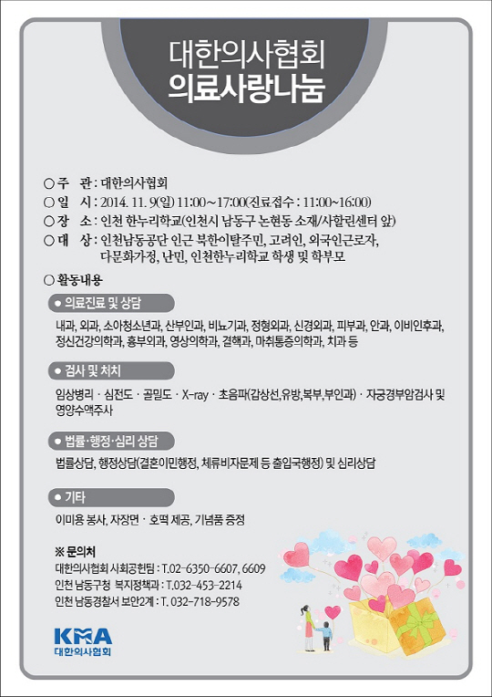 대한의사협회(회장 추무진·이하 의협)가 9일 인천남동공단 인근 북한이탈주민, 고려인, 외국인근로자, 다문화가정, 난민, 인천한누리학교 학생 및 학부모 등 700여명을 대상으로 '의료사랑나눔' 행사를 진행한다.