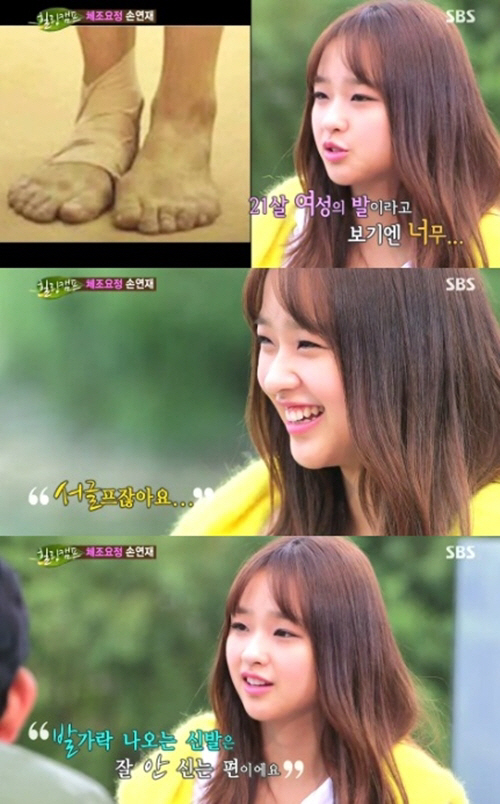 이날 MC들은 손연재의 발 사진을 공개했다. 공개된 사진 속에는 21살 여성의 발이라고 보기엔 믿기지 않는 울퉁불퉁하고 멍이 든 발이 담겨 있었다.