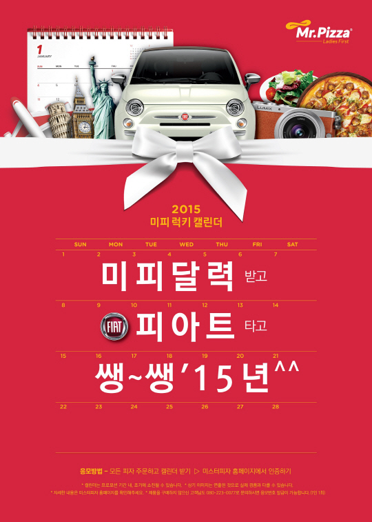 글로벌 외식문화기업 MPK그룹의 미스터피자가 88,000원 상당의 할인쿠폰이 담긴 '2015 미피 캘린더'를 선보이고 '미피달력 받고, 피아트타고 쌩~쌩 15년^^'이벤트를 진행한다.