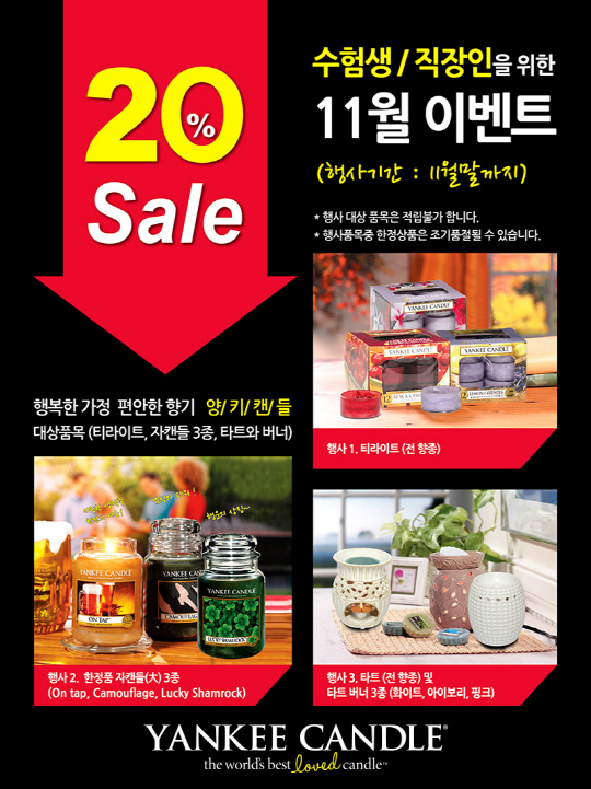 '양키캔들' 한국공식수입원 ㈜아로마무역 김진승 본부장은 "수능으로 지친 수험생과 피곤한 직장인의 심신을 풀어 주기를 바라는 마음으로 이번 프로모션을 기획했다"면서 "깊은 브랜딩의 자캔들 뿐만 아니라 실생활에서 편안하게 사용할 수 있는 타트와 티라이트를 함께 할인해 다양한 혜택을 마련했다"고 밝혔다.
