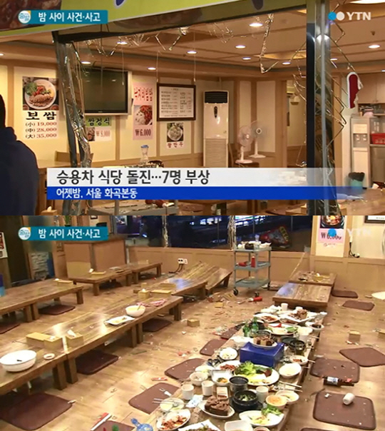 승용차 식당 돌진 7명 부상, 택시 피하려다 그만...식당 전면 유리 산산 조각 '아수라장'