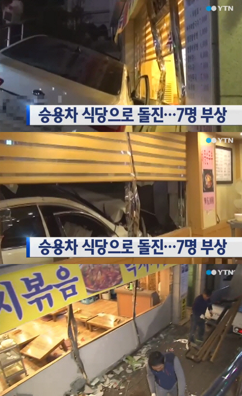 5일 경찰과 소방당국에 따르면, 이날 오후 9시57분께 강서구 화곡로 강서문화원 인근 도로에서 최모(28)씨가 모는 승용차가 도로 옆 식당을 덮쳐 이모(56)씨 등 식당 손님 7명이 얼굴 등을 다쳤다.