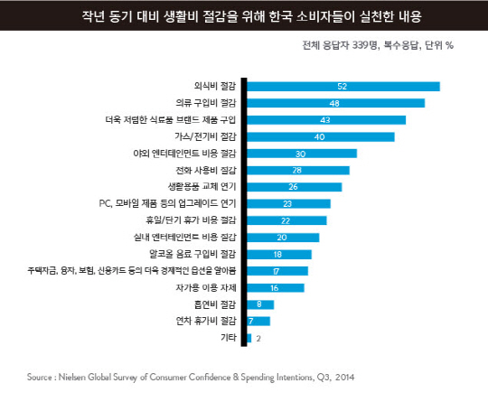 지반해 같은 기간 대비 생활비 절감을 위해 한국 소비자들이 구체적으로 취한 행동으로는 '외식비 절감(52%)', '의류 구입 자제(48%)', '더욱 저렴한 식료품 브랜드 제품 구입(43%' '가스와 전기세 절감(40%)' 등의 순으로 나타났다.