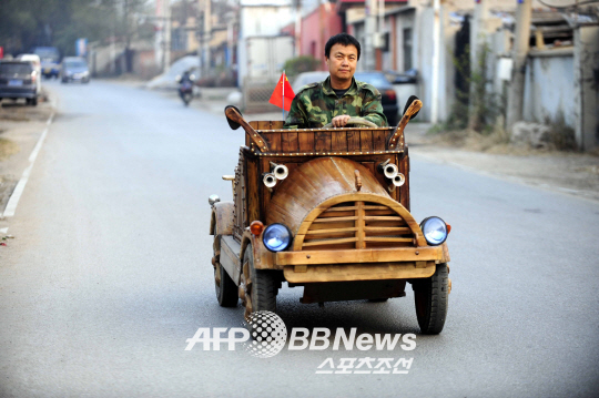 나무로 만든 자동차를 타고 다녀 화제가 되고 있다.