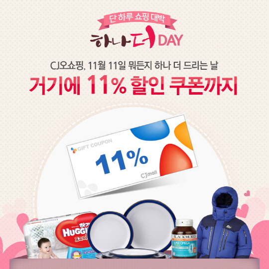 CJ오쇼핑(대표 변동식)은 시즌에 발맞춰 11월 11일 단 하루간 '단 한번의 대박쇼핑, 하나 더 데이(Day)' 세일 프로모션을 진행한다.