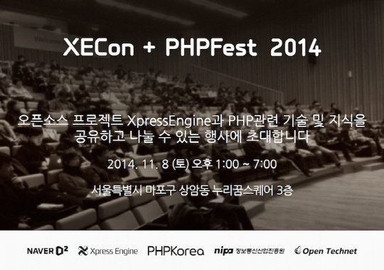 네이버(주)(대표이사 사장 김상헌)는 오픈소스 프로젝트 XpressEngine(이하 XE)과 PHP 기술지식을 공유하고 나눌 수 있는 'XECon+PHPFest 2014' 컨퍼런스를 8일 개최한다고 밝혔다.