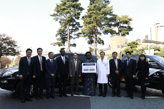 쌍용자동차가 7일 국제적인 나눔 활동의 일환으로 '아프리카 가나 보건의료교육과 의료기술지원 사업'에 의료용 지원차량으로 '렉스턴'과 '코란도 스포츠'를 기증했다. 쌍용자동차 차량개발시험담당 홍성준 상무(왼쪽에서 다섯 번째), 엘리자베스 니콜 주한가나대사(가운데), 서울대학교 치과병원 류인철 원장(오른쪽에서 네 번째) 등 관계자들이 기증 차량 앞에서 기념촬영을 하고 있다. 사진제공=쌍용자동차