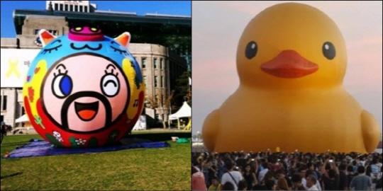 한편 초대형 돼지 풍선의 등장에 노란색 고무 오리인형인 러버덕이 덩달아 화제가 되고 있다. 지난 2007년 처음 소개된 뒤 전 세계인들의 사랑을 한 몸에 받고 있는 거대 귀요미 '러버덕'의 무게는 무려 1t에 달하며, 지난달 14일부터 전시를 시작해 오는 14일까지 전시된 후 다른 나라에서 전시를 이어갈 예정이다.