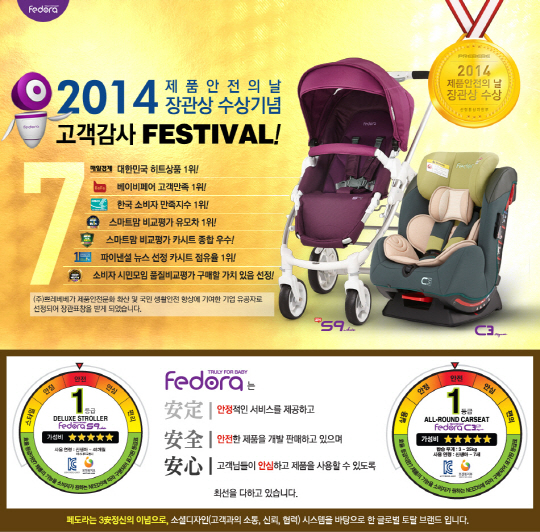 한편, 페도라는 지난 8월부터 개그맨 조윤호를 모델로 발탁, 초보 부모들 및 조부모에게 유모차·카시트 사용법을 쉽고 재미있게 알리며 인식 개선에 앞장서고 있다. 최근 이란, 두바이 수출계약으로 세계 10개국 판매 목표를 달성한 페도라는 세계 20개국 진출을 목표로 국산 제품의 우수성을 널리 알린다는 계획이다. 기타 자세한 사항은 페도라(www.fedora.co.kr, www.prebebe.co.kr, 1688-1375)에 문의하면 된다.