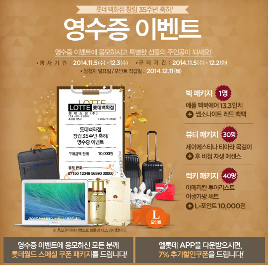 롯데백화점 공식 온라인몰 엘롯데에서 진행하는 '롯데백화점 창립 35주년 축하! 영수증 이벤트'는 상품을 구매한 모든 고객이면 누구나 참여할 수 있다. 롯데백화점에서 구매한 영수증 하단의 응모 번호 또는 엘롯데에서 결제 완료된 주문번호를 '엘롯데 웹·모바일 사이트 영수증 이벤트 페이지'에 응모하면 된다.