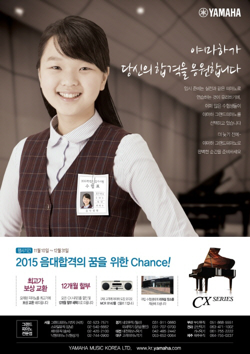 세계적인 악기음향전문기업 야마하뮤직코리아㈜(대표: 야마다 토시카즈)는 음대 입시를 준비중인 수험생을 위해 중고피아노를 최고가로 보상교환해주고, 그랜드피아노 'CX 시리즈'를 특별가에 제공하는 소비자 이벤트를 실시한다고 10일 밝혔다.