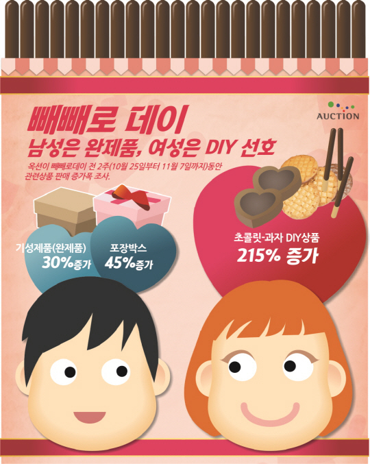 온라인마켓플레이스 옥션(www.auction.co.kr)이 빼빼로데이(11월11일)를 맞아 흥미로운 남녀 구매성향을 조사했다.