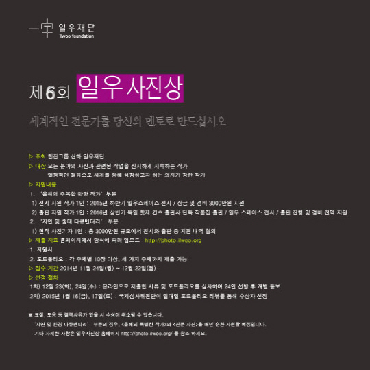 한진그룹의 공익 재단인 일우재단이 11일 사진작가를 발굴해 세계적인 작가로 육성하는 제 6회'일우(一宇) 사진상'공모를 시작한다고 밝혔다.