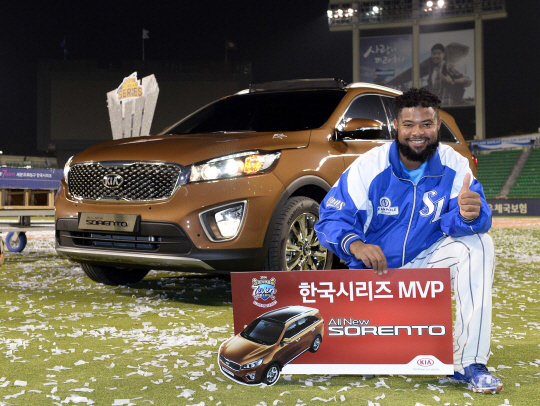 기아자동차는 지난 11일 잠실야구장에서 열린 한국시리즈 6차전이 끝난 뒤 MVP로 선정된 나바로(삼성 라이온즈)에게 부상으로 대한민국 대표 SUV '올 뉴 쏘렌토'를 수여했다.