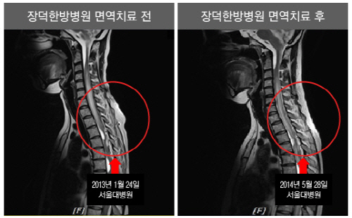 더불어 "본원에 2003년도에 소뇌 부위에 성상세포종이 발생하여 수술한 환자가 2012년 재발하여 현대의학의 항암치료 도중 하반신 장애로 인해 보행이 불가능한 상태에서 내원한 환자가 있다. 1년간의 본원 단독으로 면역치료와 비강내주입요법을 통해 현재는 종양의 감소와 보행이 가능한 상태이다." 라고 말했다.