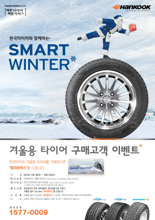 한국타이어는 이번 '겨울용 타이어 구매고객 감사 이벤트'를 통해 겨울용 타이어를 4개 이상 구매한 고객을 대상으로 성에 제거기, 차량용 방향제 등 겨울철 차량 필수용품으로 구성된 '화이트 박스'를 증정한다. 수입차 전문 프리미엄 매장인 '럭스튜디오(Luxtudio)'와 티스테이션을 포함한 전국 한국타이어 공식 대리점에서 겨울용 타이어를 구매한 고객이면 누구나 '화이트 박스'를 받을 수 있다.