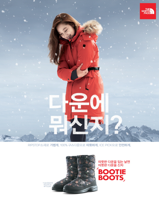 노스페이스 '부티'는 최고급 구스다운 충전재를 사용해 보온성을 극대화했으며 볼륨감 있는 디자인으로 독특하면서도 포근한 외관을 살렸다. 충격 흡수가 탁월한 미드솔(중창)과 접지력이 뛰어난 아웃솔(겉창)을 적용해 착화감을 높이고 보행의 안정성을 더했다. 올해 '부티' 신제품은 더욱 다양해진 길이와 색상에 세련된 패턴까지 더해져 소비자 선택의 폭을 넓혔고, 여성용 외 남성용 및 어린이용 제품까지 함께 구성되어 온 가족의 패밀리룩 연출에 안성맞춤인 제품이다.