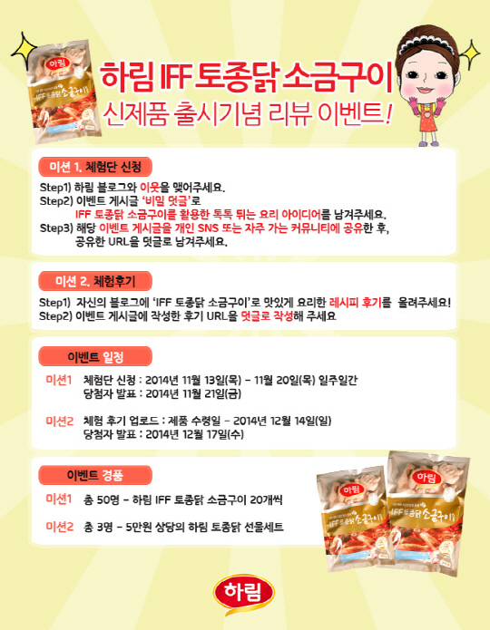 이벤트 참여는 하림 공식 블로그의 해당 이벤트 페이지에 접속해 '하림 IFF 토종닭 소금구이'로 만들고 싶은 톡톡 튀는 요리 아이디어를 덧글로 남기면 된다. 이와 함께 해당 이벤트를 SNS를 통해 활발히 공유하면 당첨 확률이 높아진다. 추첨을 통해 50명을 선발하며 당첨자에게는 '하림 IFF 토종닭 소금구이' 제품을 1인당 20개씩(1박스) 증정한다. 이벤트 당첨자는 21일 하림 블로그를 통해 발표할 예정이다.