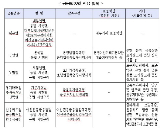 현행 여신상품 관련 법제는 대출, 신용카드, 금융리스 등 여신상품이 아니라 대부업, 은행업, 보험업, 여신전문금융업 등 업종별로 구성돼 있다. 이로 인해 같은 기능의 여신상품이라 하더라도 업종별 개별법에 따라 상이한 규제가 적용되는 등 관련 법제의 체계성이 부족하다. 그 여파로 규제 공백도 발생할 수 있는 것으로 지적됐다.