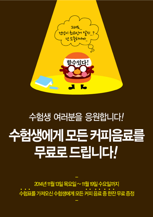 모스버거는 대학수학능력시험 준비로 고생한 수험생에게 커피를 무료로 증정하는 특별 이벤트를 진행한다. 수험표를 지참한 고객에게는 카라멜마끼아또, 카페모카, 카페라떼, 아메리카노, 모스커피 등 모스버거에서 판매하는 모든 커피 메뉴 중 한잔을 무료로 증정한다. 이벤트는 13일부터 19일까지 일주일간 진행되며, 센트럴시티점과 광복롯데점을 제외한 전국 모스버거 매장에서 참여할 수 있다.