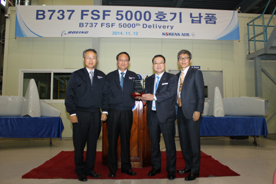 13일 대한항공에 따르면 지난 12일 부산에 위치한 테크센터에서 함명래 항공우주사업본부장, 트로이 킴(Troy Kim) 보잉 아시아담당 임원 등 양사 관계자들이 참석한 가운데 'B737 FSF 5000호기 납품 기념식'을 개최했다.