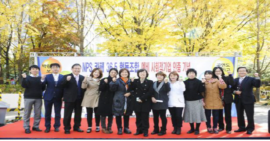◇11월.10일 국민연금공단 잠실 본사에서 예비 사회적기업 지정 박람회를 개최하고 이원희 기획이사(사진 왼쪽에서 7번째)와 NPS 카페 36.5° 협동조합 조합원들과 임직원들이 기념촬영을 하고 있다.