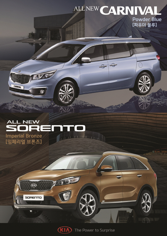 기아자동차는 올 뉴 카니발의 '파우더 블루' 컬러와 올 뉴 쏘렌토의 '임페리얼 브론즈' 컬러가 한국색채학회가 선정하는 '2014 한국색채대상'에서 최고 영예의 대상(산업통상자원부장관상)을 수상했다고 밝혔다.