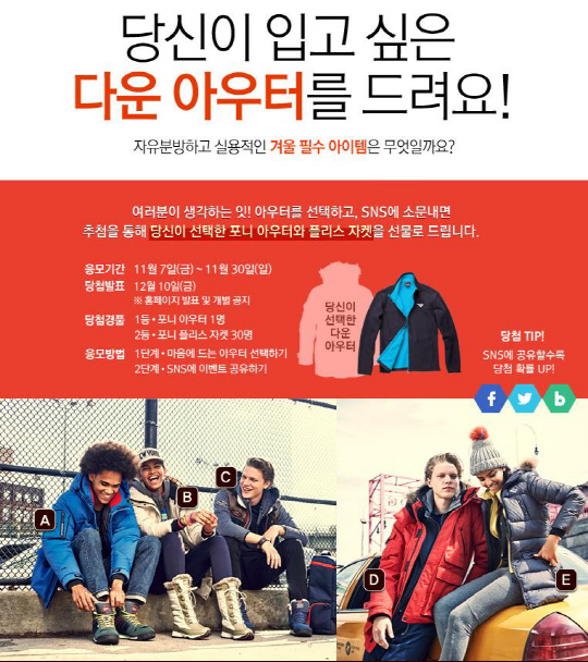 스프리스 홈페이지(www.spris.com)에서는 30일까지 '다운 아우터를 드려요' 이벤트도 실시한다. 이벤트 페이지에서 5가지 스타일의 아우터 중 원하는 아이템을 선택하고, SNS에 이벤트 공유 후 댓글을 달면 자동 응모된다. 1등 1명에게는 포니 아우터, 2등 30명에게는 포니 플리스 자켓을 선물로 증정한다.