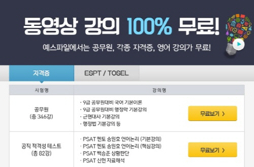국내 최대 파일공유 사이트 예스파일(www.yesfile.com)이 공무원 및 각종 자격증 시험, ESPT/TOSEL 영어 등 교육 동영상 강의 무료 서비스를 시작했다.