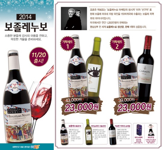 각 기획세트(보졸레누보+아이스파이까버네멜롯 또는 보졸레누보+카르멘카버네쇼비뇽)는 평소 판매가격이 각 4만3천원과 3만9천원으로, GS25는 올해 보졸레누보 출시를 기념해 알뜰한 가격(각 2만3천원)으로 보졸레누보와 와인을 즐길 수 있도록 세트 와인을 기획했다.