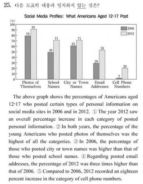 해당 문항은 '미국 청소년들의 2006년과 2012년 소셜미디어 이용 실태' 도표를 보고 도표와 일치하지 않는 보기를 고르는 문제다.