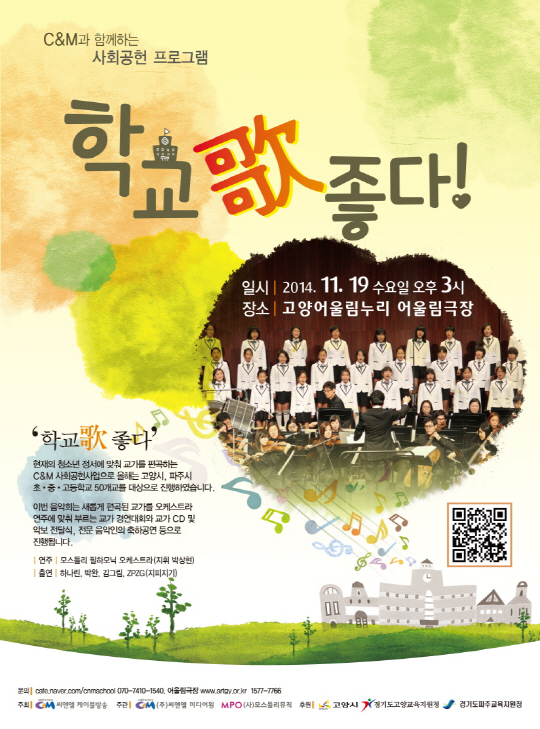'2014 학교歌 좋다' 음악회에는 새롭게 교가를 전달받은 고양시, 파주시의 12개교가 참가하는 교가경연대회가 펼쳐지며, 팝페라 소프라노 하나린, 테너 박완, 가수 김그림, 보이그룹 지피지기의 축하공연도 마련되어 있다. 또 교가 CD 및 악보 전달식 등이 함께 열려 학생, 학부모, 지역 주민들에게 다양한 볼거리를 제공할 예정이다.