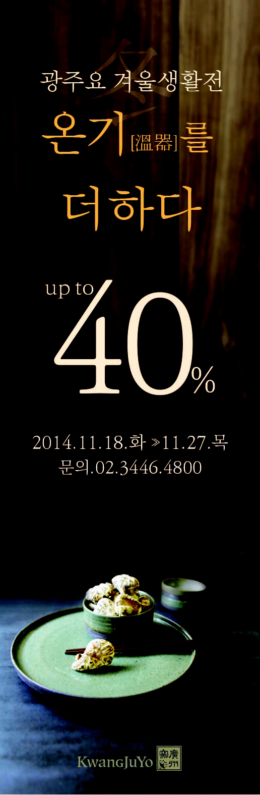 광주요는 신제품 출시에 맞춰 겨울맞이 기획 '겨울생활展'을 18일부터 27일까지 10일 간 광주요 직영점(서울 가회점, 서울 한남점)에서 진행한다. 이번 기획전은 '겨울생활, 온기(溫器)를 더하다'라는 주제로, 신제품 온 콜렉션을 비롯해 △내열자기, △모던·캐주얼라인 등 겨울철 쓰임이 많은 제품을 선보인다. 한남점에선 전 제품 최대 40% 할인의 특별 행사를 진행된다.(문의: 가회점 02-741-4801, 한남점 02-3446-4800)