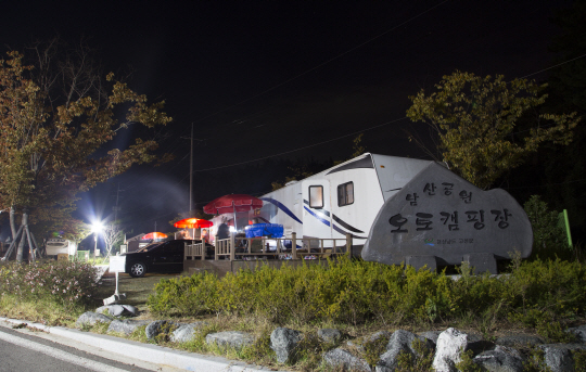 고성 남산공원 오토캠핑장은 눈앞에 바다가 펼쳐진다. 바다 위를 걷는 해안 산책로의 야경이 특히 아름답다. 주변에 바다낚시나 갯벌 체험 등 즐길 거리가 많고, 캠핑장 내 캐러밴 시설도 대여한다.
