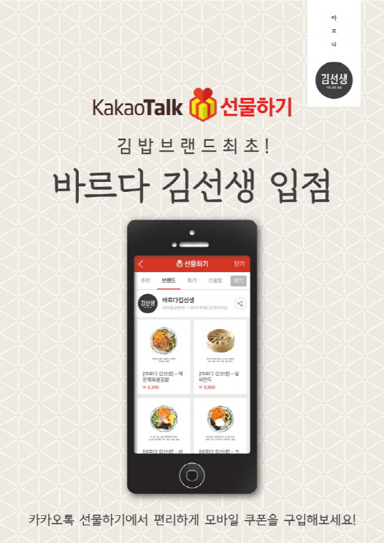 바르다 김선생 마케팅 담당 김태연 과장은 "최근 모바일 쿠폰으로 간편하게 선물을 주고 받는 고객들의 소비 패턴을 반영해 건강하고 맛있는 프리미엄 김밥을 선물할 수 있도록 카카오톡 선물하기 브랜드관에 입점하게 됐다"며 "앞으로 고객들이 바른 식재료로 만든 바르다 김선생을 더욱 편리하고 건강하게 만나볼 수 있도록 접점을 지속적으로 확대해 나갈 예정"이라고 말했다.