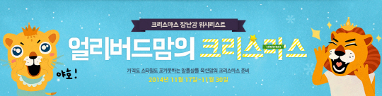 또 크리스마스를 앞두고 장난감 신상품 인기투표, 할인쿠폰 증정, 100원 상품 체험 이벤트를 연다. '또봇 델타트론', '반다이 요괴워치', '겨울왕국 퓨처북', '뽀로로 경찰놀이세트' 등 크리스마스 히트예감 장난감 10종 인기투표가 진행되며 투표 참가회원에게는 장난감 카테고리에서 1만원 이상 구매 시 사용 가능한 2천원 할인쿠폰을 발급한다. 장난감 체험에 신청하면 추첨을 통해 100명에게 10가지 장난감 중 1개를 100원에 증정한다. 이외에도 인기 장난감 신상품 체험단에 응모하면 추첨을 통해 총 100명에게 100원에 신상품 체험 기회를 준다. 리틀타익스 '원목 주방놀이', '람보르기니 무스시엘라고' 전동차, '쥬비 전동오토바이' 등 유아동 장난감 신상품 6종이 준비되어 있다.
