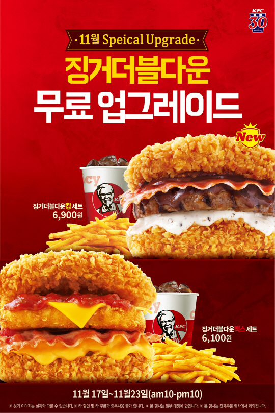 KFC(www.kfckorea.com)가 오는 23일까지 '징거더블다운 시리즈' 2종 단품을 무료로 업그레이드해주는 행사를 진행한다.