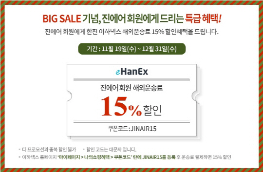 진에어(대표 마원)가 해외 직구가 활발한 연말 시즌을 맞아 진에어 회원을 대상으로 해외 배송 대행 서비스인 이하넥스(eHanEx)의 해외 운송료를 15% 할인해주는 혜택을 12월 31까지 진행한다.