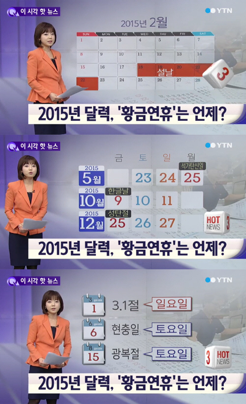 설날 닷새 황금연휴, 달력에 표시해야겠다", "2015년 황금연휴, 목 빠지게 기다려질 듯", "2015년 황금연휴, 벌써 내년 휴일을 챙기고 있다", "2015년 황금연휴, 휴가가고 싶다", "2015년 황금연휴, 보릿고개 연휴는 보기만 해도 우울하다", "