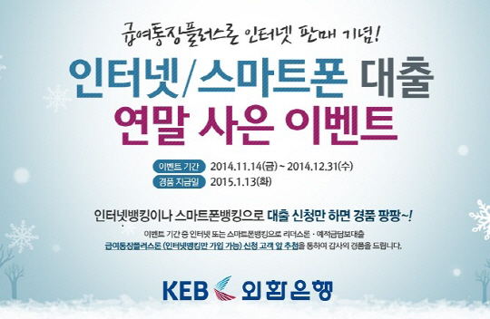 외환은행(은행장 김한조/www.keb.co.kr)은 지난 12일부터 급여이체 직장인을 대상으로 한 '급여통장 플러스론'의 온라인 판매 채널 확대를 기념하여 온라인 대출 신청 고객 앞 추첨을 통해 감사의 경품을 드리는 『인터넷/스마트폰 대출 연말 사은 이벤트』를 진행 중이라고 20일 밝혔다.