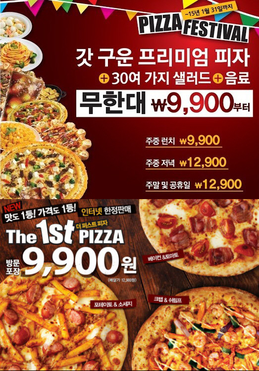 피자헛은 내년 1월 31일까지 시즌 한정으로 100분간 피자를 무제한으로 즐길 수 있는 무제한 피자 페스티벌을 진행한다. 매장에서 갓 구운 다양한 피자와 샐러드, 음료를 즐길 수 있다. 특히 리치골드, 치즈크러스트, 크라운 포켓 등 프리미엄 피자와 베스트 피자를 한 조각 단위로 무제한 제공한다.