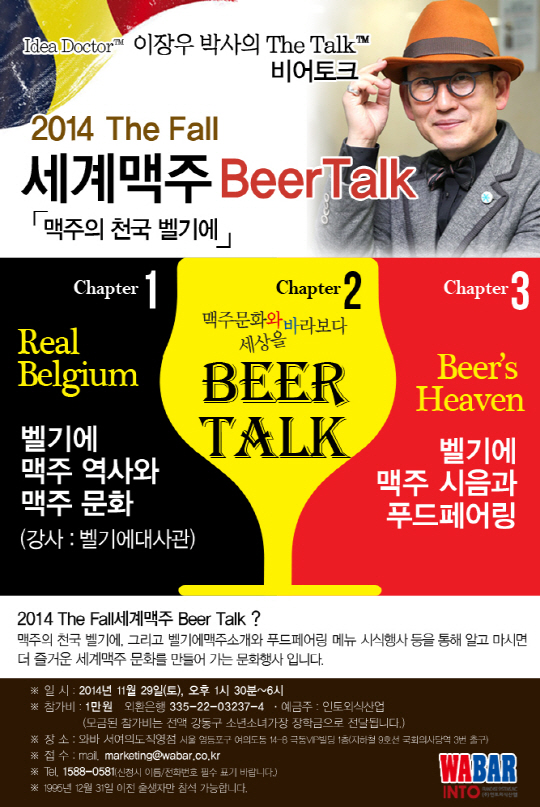 24일 와바에 따르면 비어토크는 세계맥주를 시음하며 맥주의 문화와 역사에 대한 다양한 정보를 공유하는 문화행사다. 비어토크 벨기에편에서는 약 20여 종의 벨기에 맥주를 시음할 수 있다. 가장 오래된 수도원 맥주인 트라피스트 맥주와 알콜도수가10도 이상인 맥주, 부드러운 에일, 강한 트리플 홉 맥주 등 다양한 벨기에 맥주가 포함되어 있다.